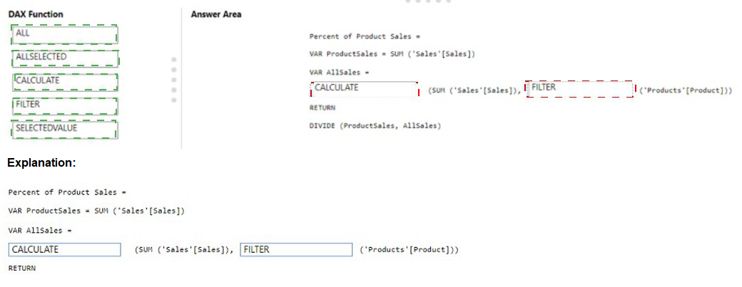 How should you complete the DAX measure? To answer drag the appropriate DAX functions to the correct targets- Each function may be used once, more than once, or not at all the spirt bar between panes or scroll to view content.