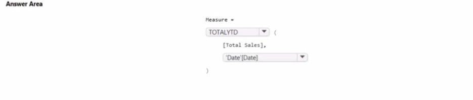 You have a Power Bl report that contains a measure named Total Sales. You need to create a new measure that will return the sum of Total Sates for a year up to a selected date. How should you complete the DAX expression? To answer, select the appropriate options in the answer area.