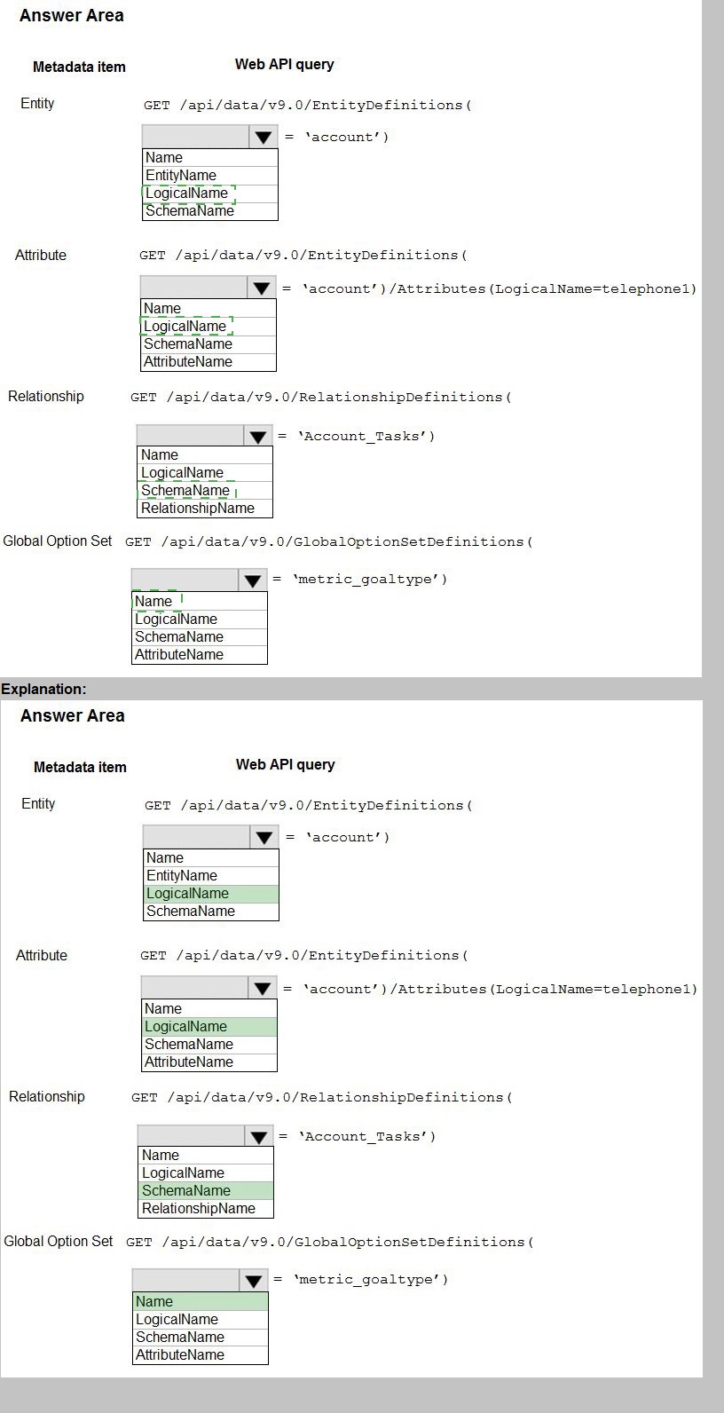 You need to use the Dynamics 365 Sales Web API to retrieve metadata information. How should you complete the Web API queries? To answer, select the appropriate options in the answer area. NOTE: Each correct selection is worth one point.