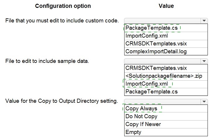 You are creating a package for a Power Platform solution. The package will include custom code and sample data. The package must include all files that need to be installed.You need to configure the package.