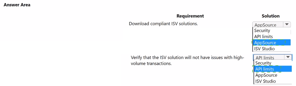 The company requires an off-the-shelf ISV solution for customer fund deposits that can handle high transaction volumes during peak hours. The first requirement involves finding a compliant, trusted ISV solution. The second requires verifying that the solution can scale to meet transaction demands. AppSource is the official marketplace for discovering and downloading compliant ISV solutions, while API limits evaluation ensures the solution can handle high-volume transactions without performance issues.