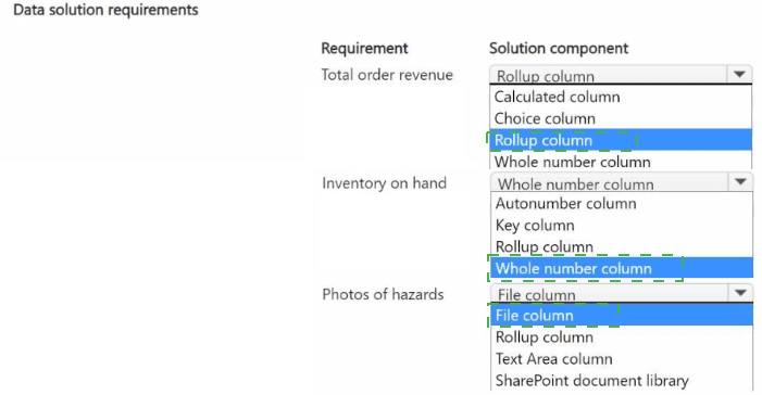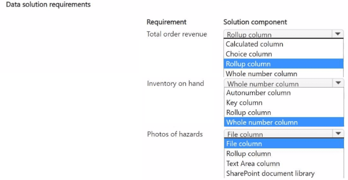 The retailer requires specific Dataverse components to address operational needs: a consolidated view of order revenue, real-time inventory availability, and photo capture for hazards. Each requirement maps to a distinct Dataverse feature that provides the necessary functionality with minimal custom development.