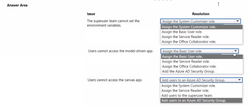 The production environment is secured by an Azure AD security group, meaning only members of that group can access the environment and its resources. The superuser team needs elevated permissions to manage environment variables in make.powerapps.com. Users in the group cannot access the model-driven or canvas apps, which typically indicates missing security roles or app-specific permissions. The resolutions involve assigning appropriate roles and ensuring proper app sharing.