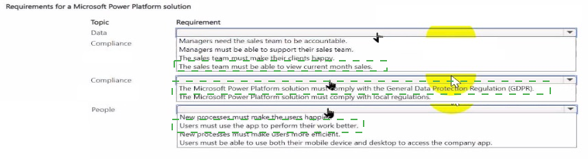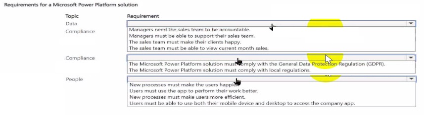 Which requirement should you use for each topic? To answer, select the appropriate