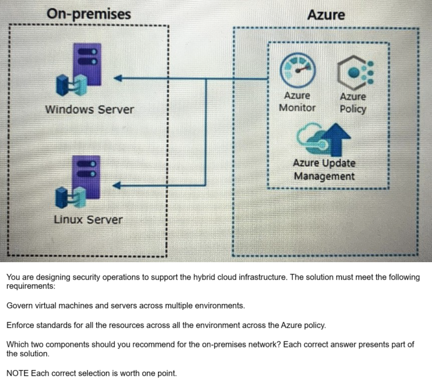 This question tests your knowledge of extending Azure governance and policy enforcement to on-premises servers in a hybrid environment. The requirements specify governing VMs across multiple environments and enforcing Azure Policy standards on all resources. Azure Arc enables non-Azure machines to be projected into Azure as resource types, while guest configuration inside Azure Policy allows auditing and configuring settings inside VM operating systems .