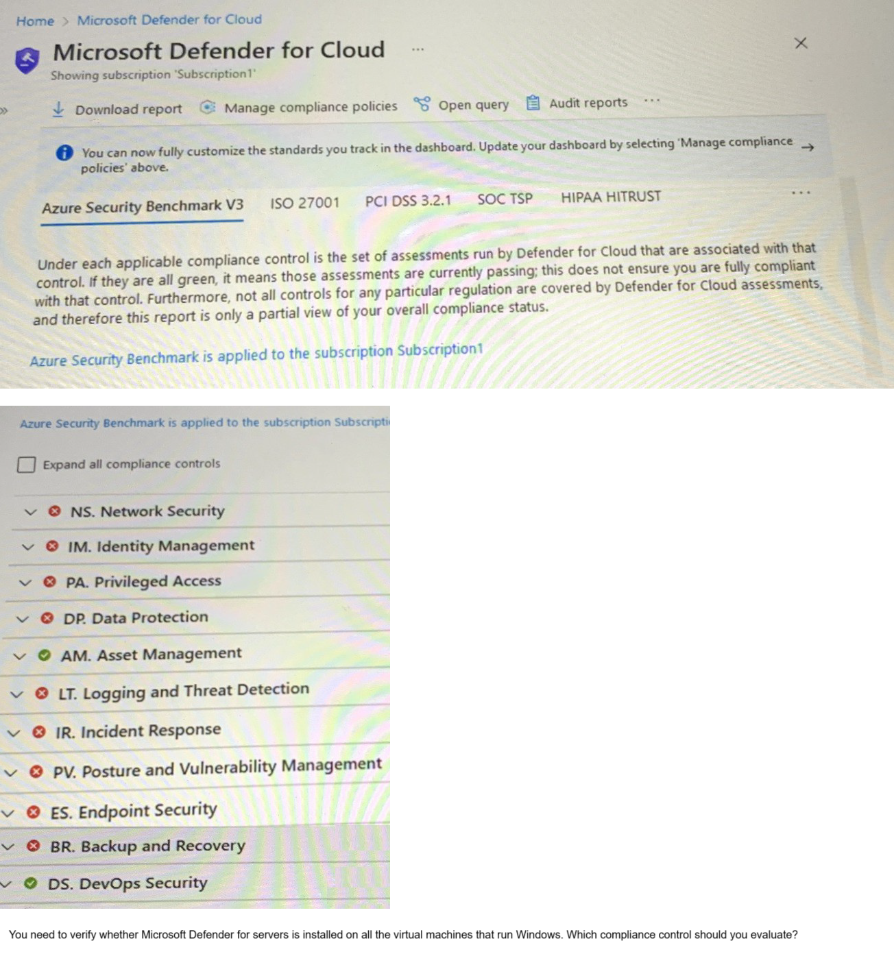 This question tests your knowledge of Microsoft Defender for Cloud regulatory compliance controls and their specific assessments. You need to verify whether Microsoft Defender for servers (formerly Microsoft Defender for Endpoint) is installed on Windows VMs. This is a threat detection and endpoint protection configuration check. Within Azure Security Benchmark V3, the specific control that monitors endpoint protection installation and health is Endpoint Security (ES) , not Incident Response (IR) .