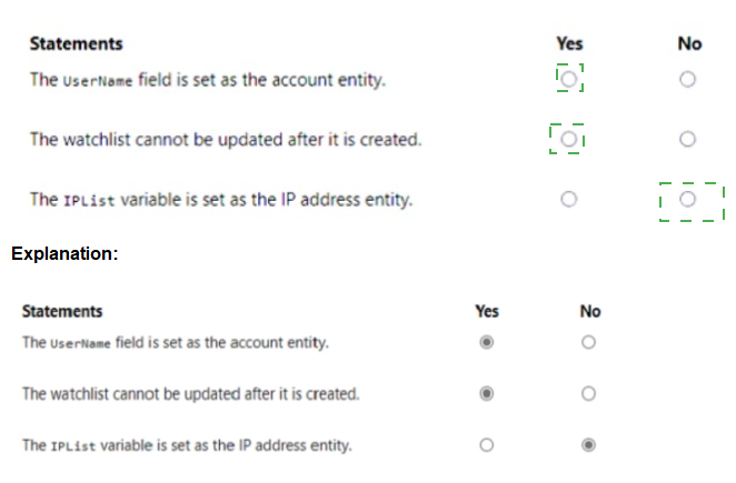 (For statement 3) Saying "Yes" would be incorrect.While the query uses IP addresses, the variable IPList contains the watchlist data. Entity mapping requires using specific built-in entity identifiers like IPCustomEntity in the query's extend or project clause, which is not done here for the IPList variable itself.