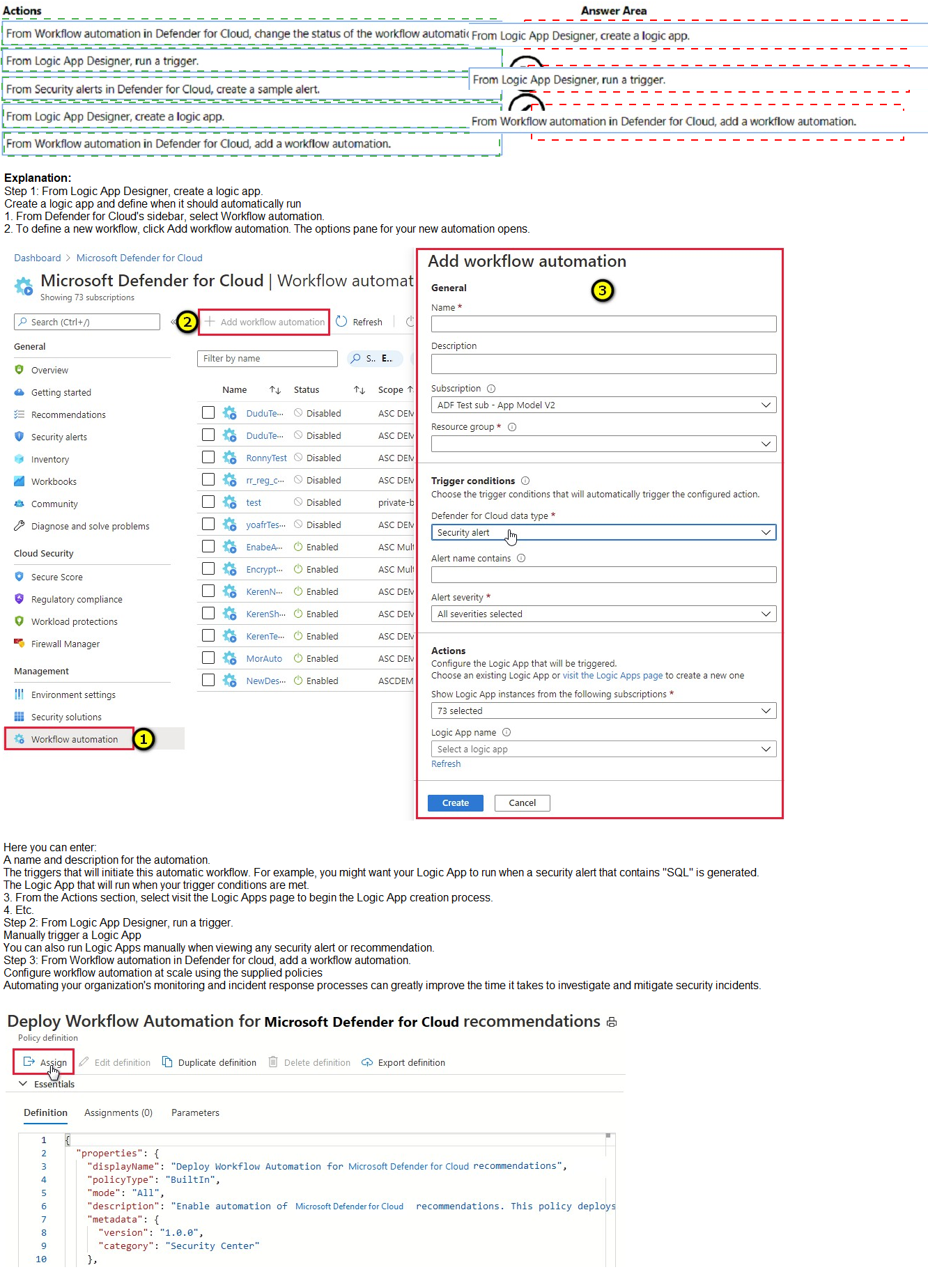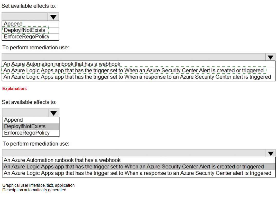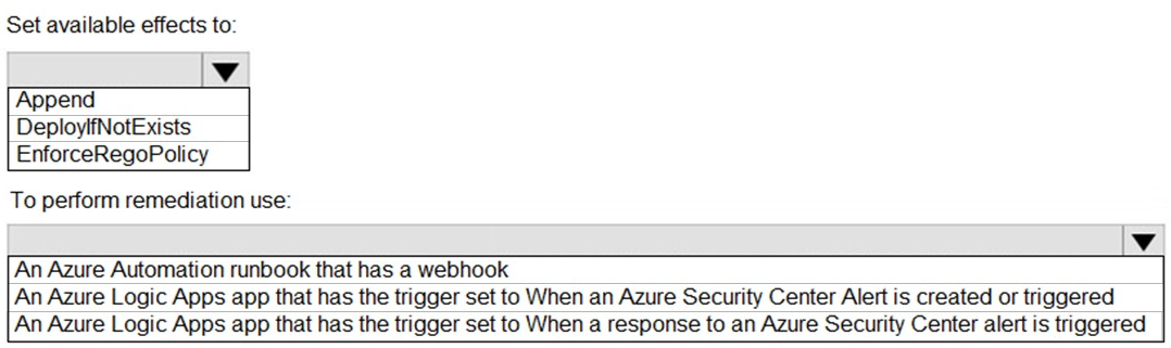 The question is about using Azure Policy's DeployIfNotExists effect to automatically remediate non-compliance, triggered by Azure Security Center (ASC) alerts. Workflow automation in ASC can launch a Logic App in response to an alert. The policy effect must be able to deploy resources to enforce state, and the automation must be triggered by the alert itself, not a manual response action.