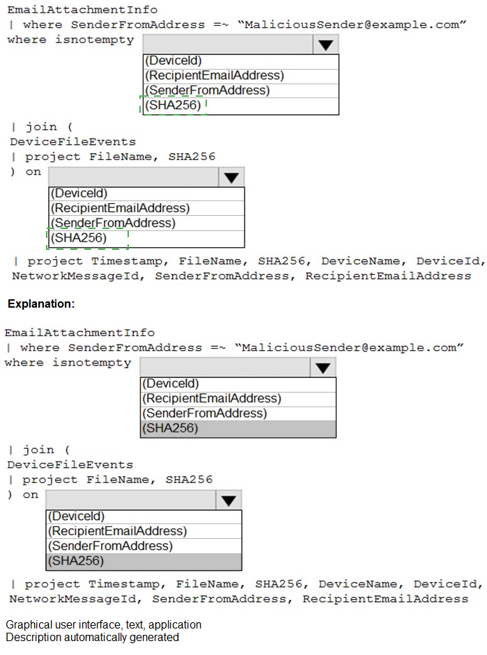 This Kusto Query Language (KQL) question requires creating an efficient join between two tables to find devices where email attachment hashes match file hashes on devices. The goal is to identify the correct join key and the required fields from each table. A join should use a unique, common key present in both tables for accurate results, which in this case is the SHA256 hash.