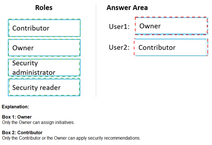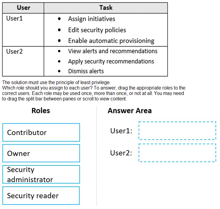 This question applies the principle of least privilege to assign Azure Active Directory (Azure AD) built-in roles at the subscription level. The roles must grant only the permissions necessary for the listed tasks. The key distinction is that User1 needs permissions to configure security settings (policies, provisioning), while User2 only needs permissions to view and act on existing security data (alerts, recommendations) without changing the underlying configuration.