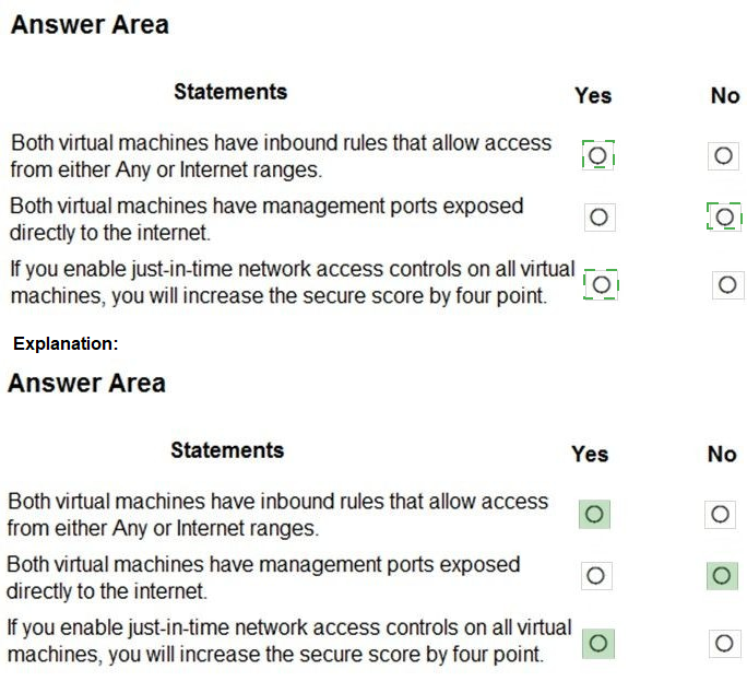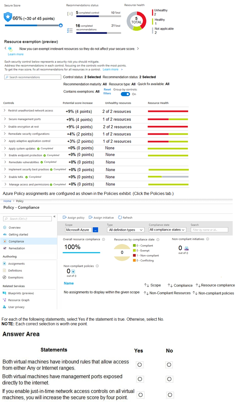 This question requires analyzing the Azure Security Center secure score breakdown and connecting it to policy compliance and potential remediation actions. The secure score increase percentages shown correspond to fully remediating specific security controls. We must deduce the current state of the VMs from the "unhealthy resources" counts and the potential score impact of enabling Just-In-Time (JIT) VM access.