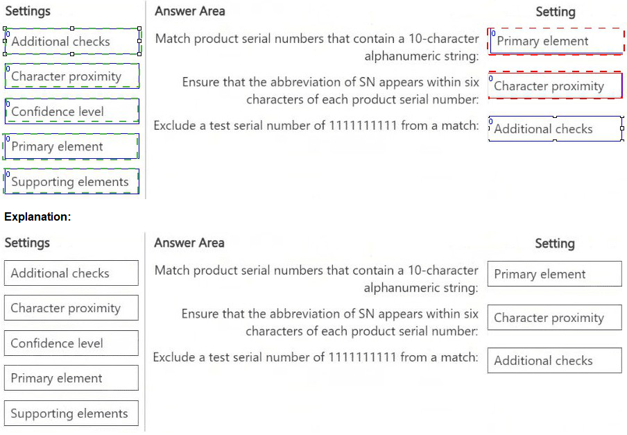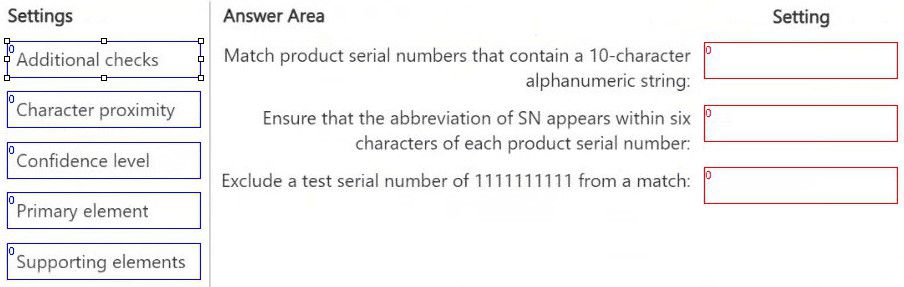 This question tests your knowledge of configuring custom sensitive information type (SIT) patterns in Microsoft Purview. Each requirement corresponds to a specific pattern setting: the element that defines the pattern, the proximity requirement, and the exclusion condition.