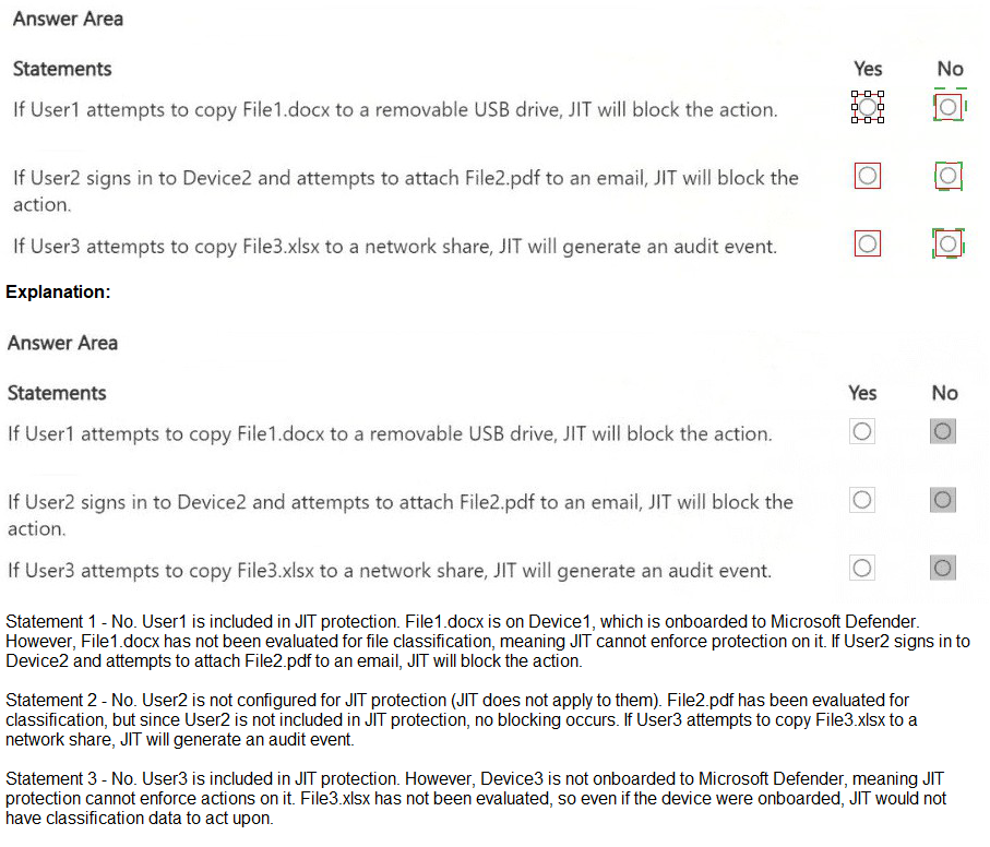 This question tests your knowledge of Just-In-Time (JIT) protection in Microsoft Purview. JIT applies DLP restrictions to users scoped into the policy when they attempt risky actions. JIT requires: user scoped as “Included,” device onboarded to Defender, and file evaluated by the JIT policy. If any of these are missing, JIT does not enforce.