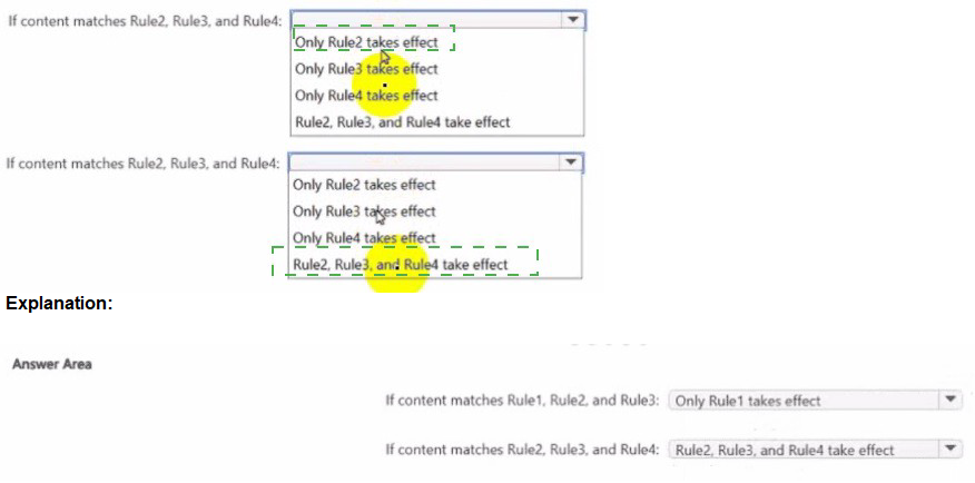 (The question appears duplicated in the exhibit; same scenario repeated. The answer remains Only Rule2 takes effect.)