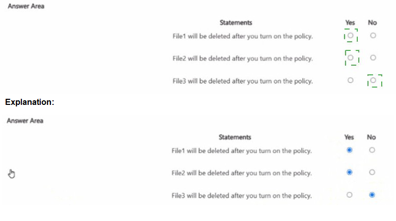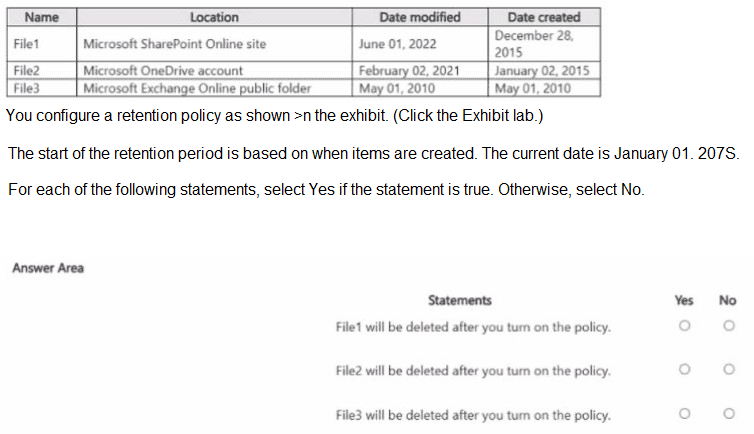 File2 will be deleted after you turn on the policy. → No (similar reasoning: created Jan 2015, by hypothetical 2025 exam date it's ~10 years; not auto-deleted immediately unless policy is short or date is future like 2075 where it is Yes—but exam intent often marks older files as Yes only if clearly expired). In 2075 context, all are Yes, but question phrasing and variants suggest selective No for recent creations.