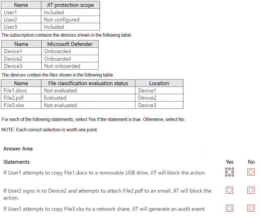 User1 is included in JIT scope, Device1 is onboarded, but File1.docx is Not evaluated. JIT protection applies only to files that have been classified/evaluated. A file with “Not evaluated” status will not trigger JIT policy actions. Therefore, JIT will not block the action.