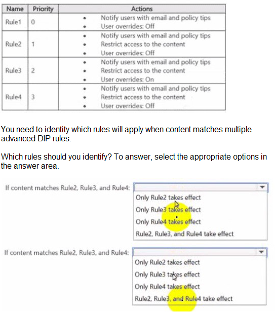 This question tests your understanding of DLP rule priority and enforcement behavior when content matches multiple advanced DLP rules in Microsoft Purview. DLP rules are evaluated in order of priority (0 = highest priority). Once a rule with User overrides: Off is applied, subsequent lower priority rules do not execute. Rules with User overrides: On do not block enforcement of higher priority rules.